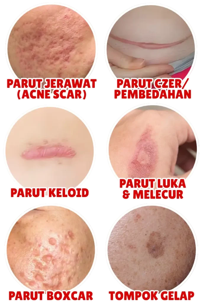 Sesuai untuk parut jerawat, chicken pox, czer/pembedahan, keloid, luka & tompok gelap.